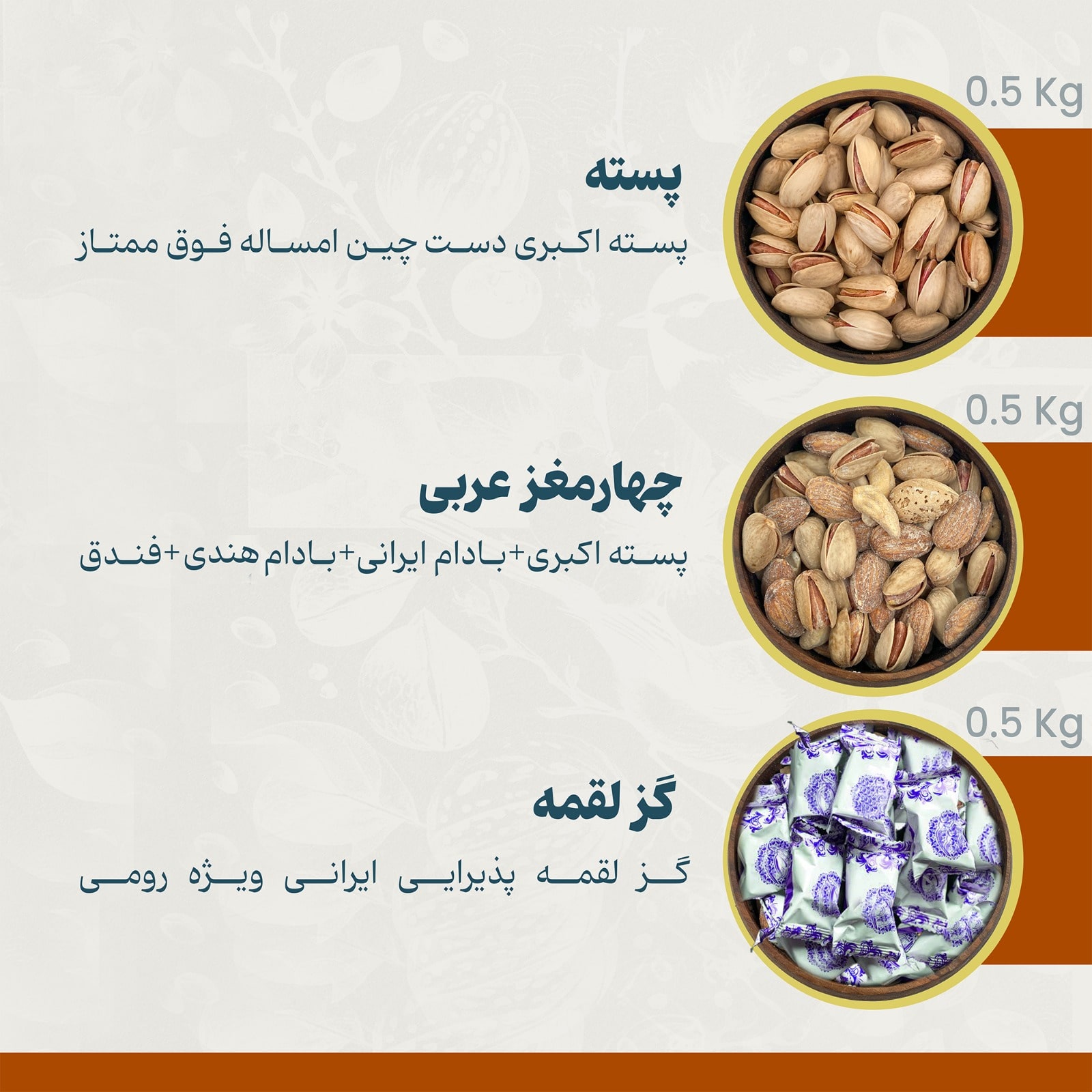 • آجیل جهارمغز عربی  (پسته اکبری+بادام ایرانی+بادام هندی+فندق)