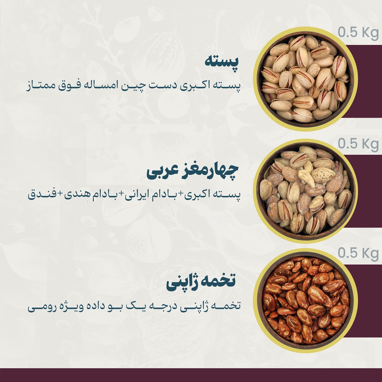 • آجیل جهارمغز عربی (پسته اکبری+بادام ایرانی+بادام هندی+فندق)